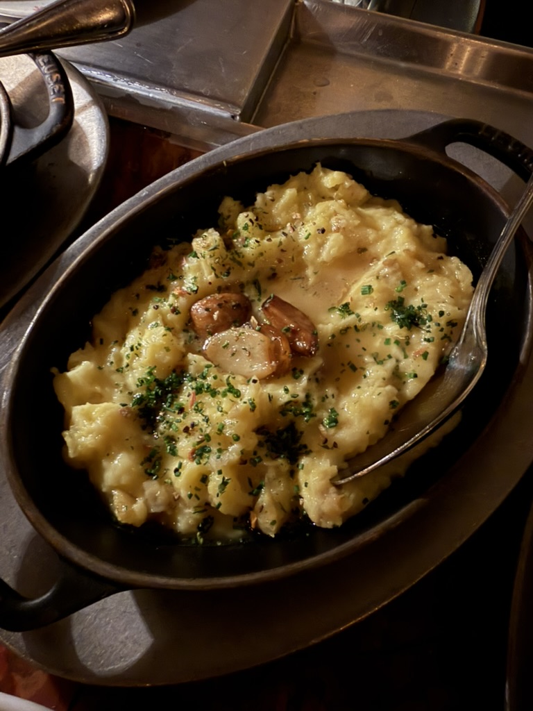 A staple side dish that exemplifies the restaurant’s approach to richness. The potatoes are milled to a velvety, smooth consistency and incorporated with a high volume of butter and likely chicken jus for added depth. They serve as a dense, creamy counterpoint to the structure of the steaks.