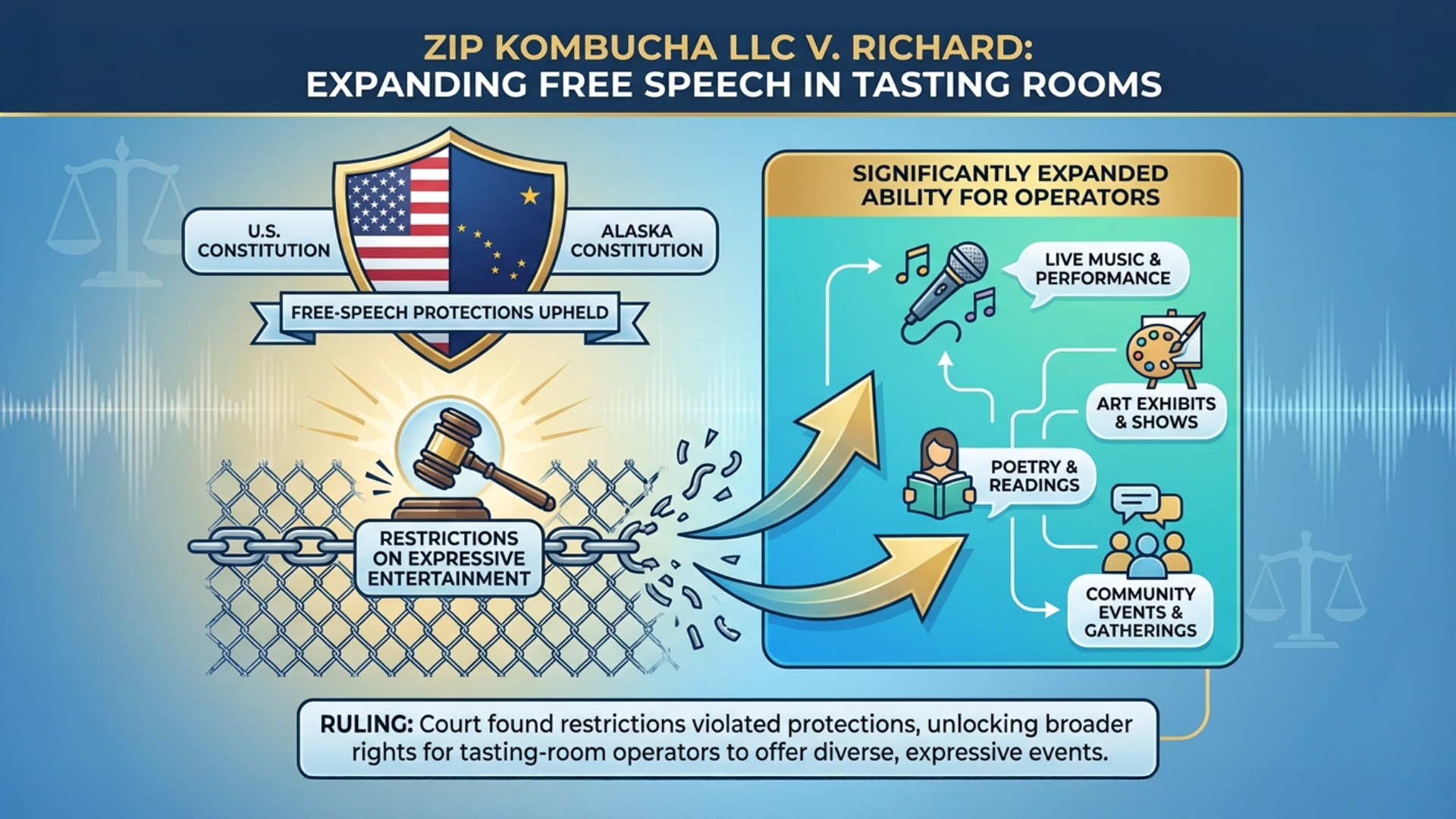 This legal analysis covers a January 2026 decision by an Alaska Superior Court that struck down key provisions of Senate Bill 9, which had limited breweries and wineries from hosting live music and most “non-product-focused” entertainment in their tasting rooms. In Zip Kombucha LLC v. Richard, the court ruled those restrictions violated free-speech protections under both the U.S. and Alaska constitutions, significantly expanding tasting-room operators’ ability to offer expressive entertainment and other events.  From the article: