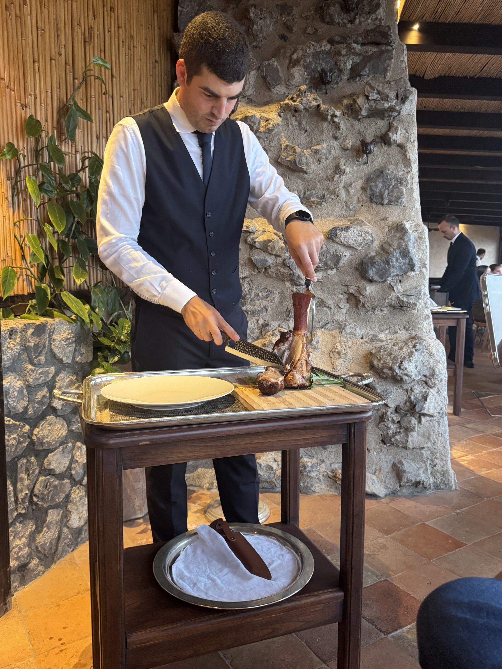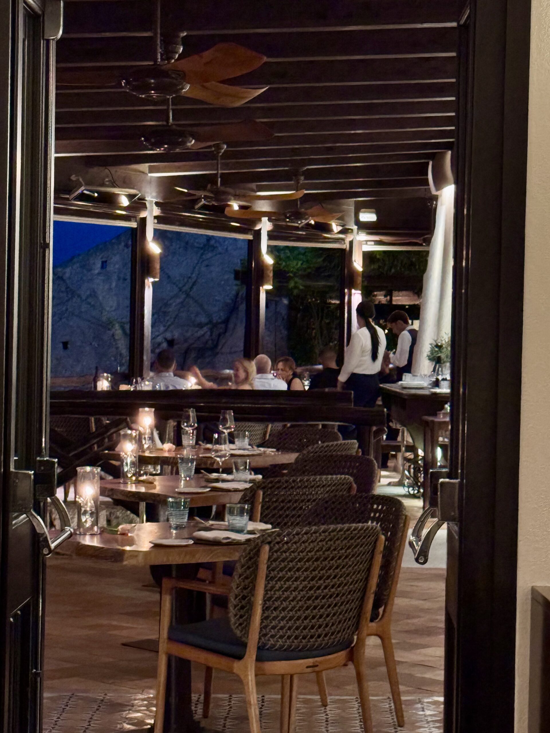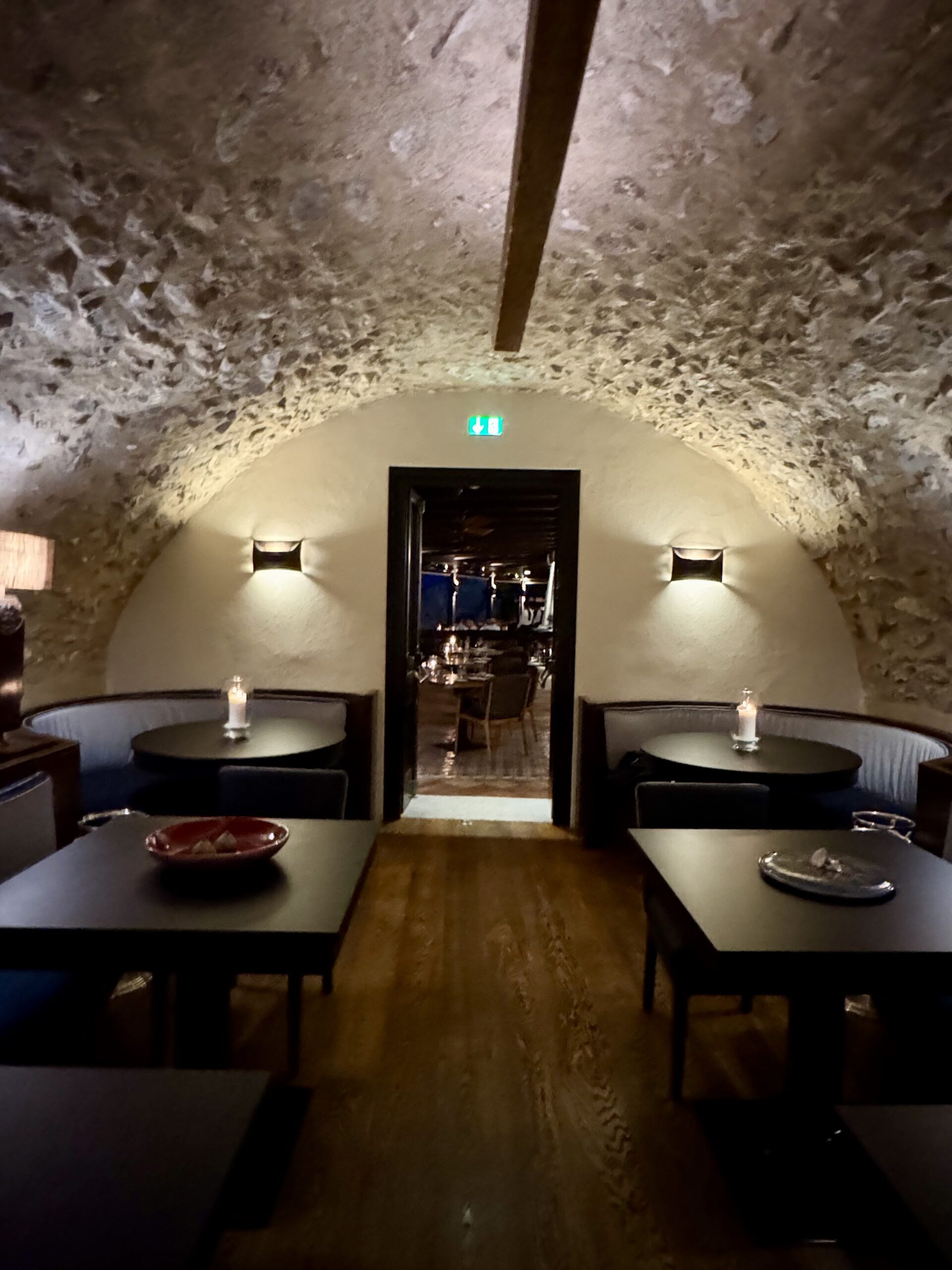 The dining room features vaulted ceilings and stone walls that recall the building’s monastic origins. An outdoor terrace provides an open-air option during warmer months. Lighting is kept low to foster a calm environment while ensuring plates remain visible. Service is formal yet unobtrusive, characterized by staff who demonstrate strong menu knowledge and deliberate pacing. The acoustic environment is controlled, allowing for conversation without significant background noise.