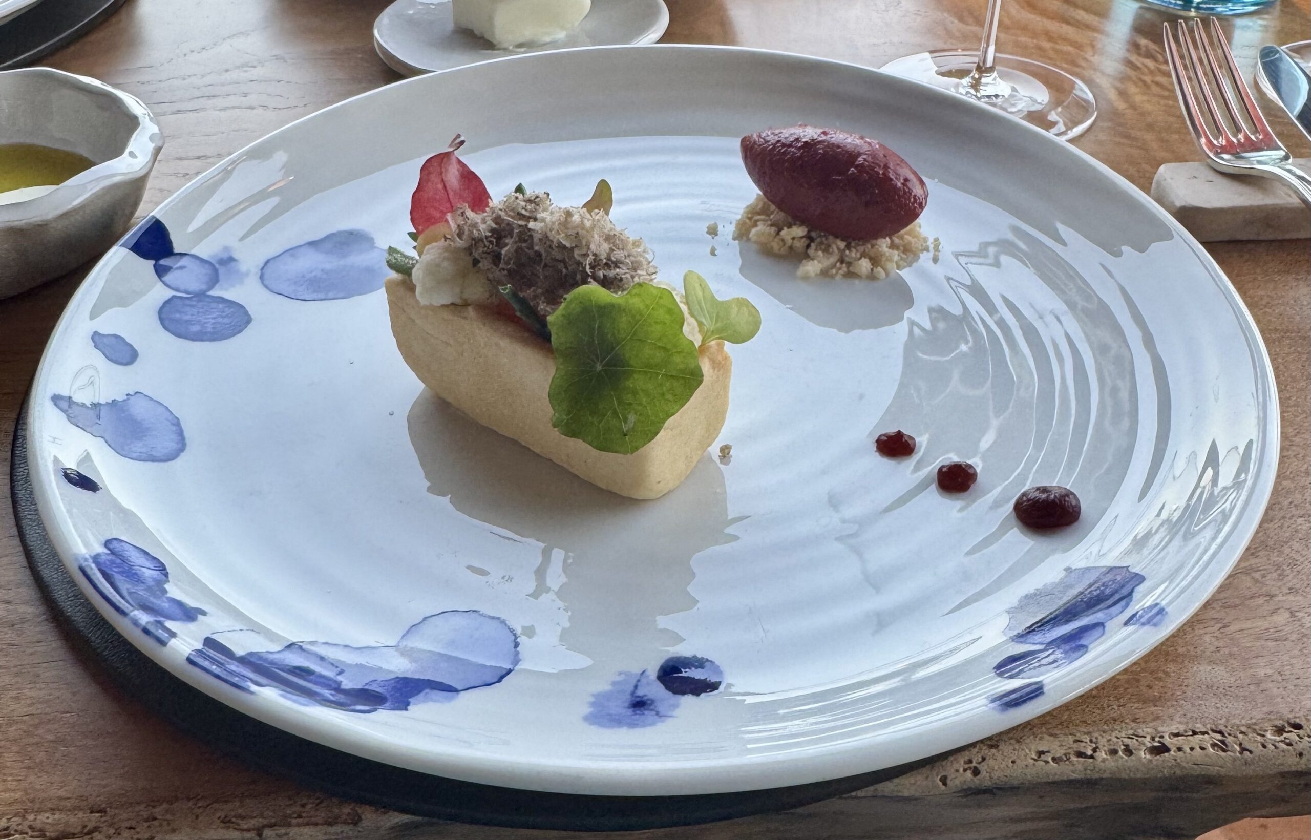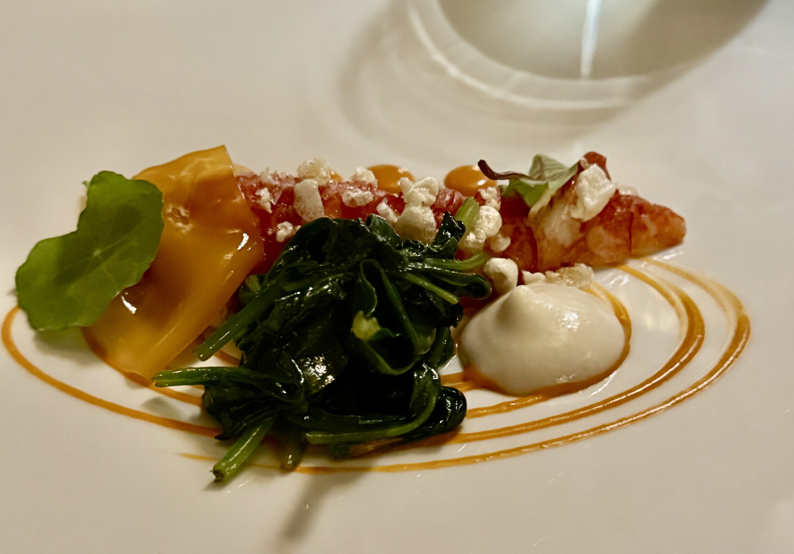 The blue lobster is served alongside a smooth chickpea purée. The earthiness of the legume contrasts with the sweetness of the shellfish, creating a balanced profile that avoids excessive richness.