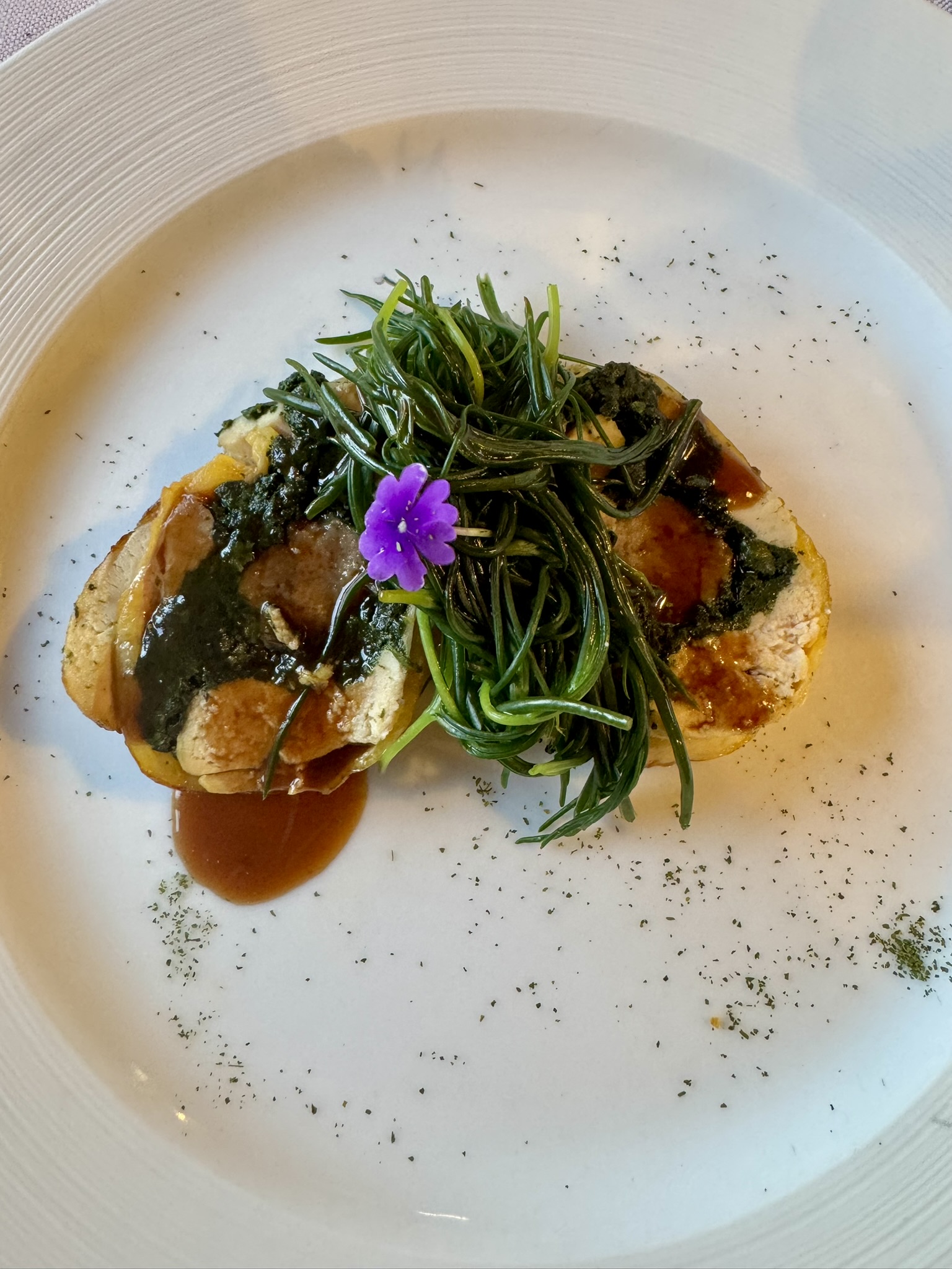 • Artichoke Crème Brulée paired creaminess with subtle bitterness, showing technical precision in texture.