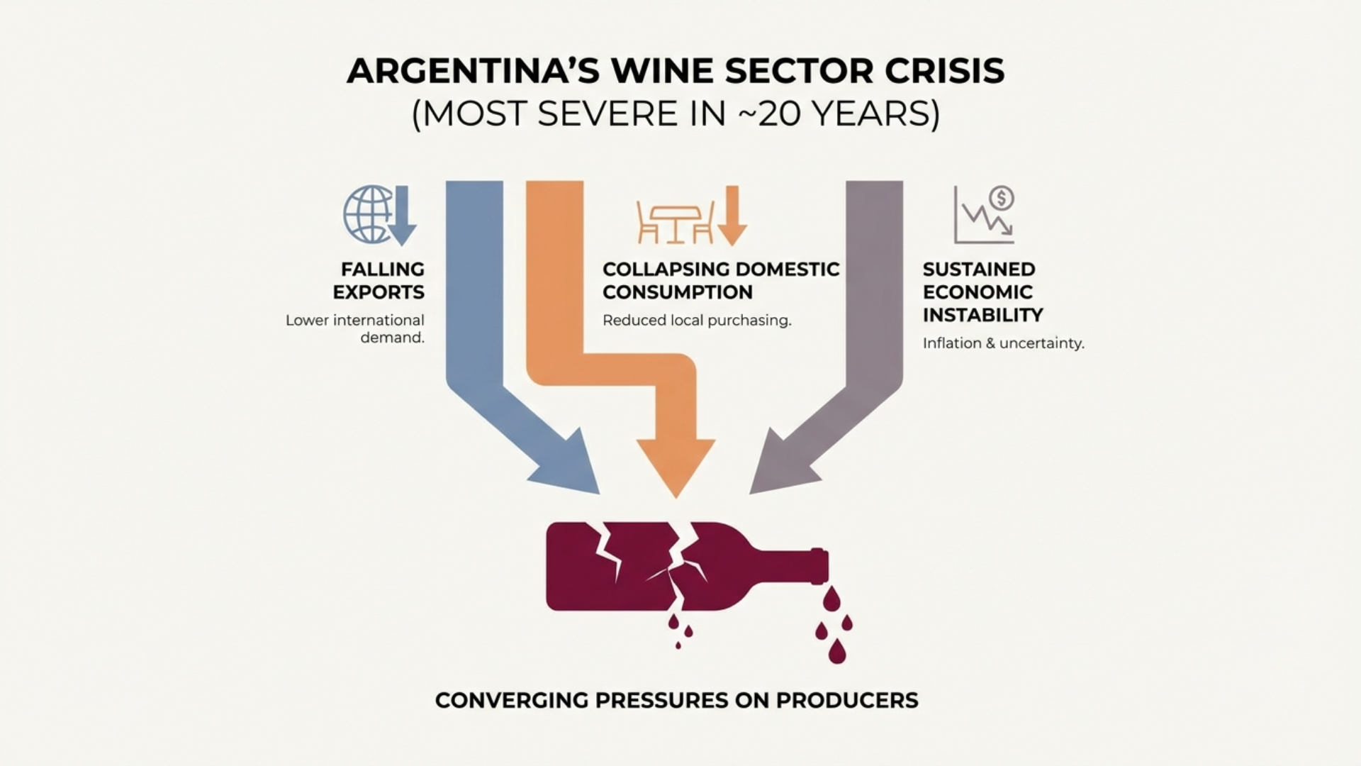 In United Press International, Banyeliz Muñoz reports that Argentina’s wine sector is enduring its most severe crisis in roughly 20 years, as falling exports, collapsing domestic consumption, and sustained economic instability converge to pressure producers across the country. From the Article: