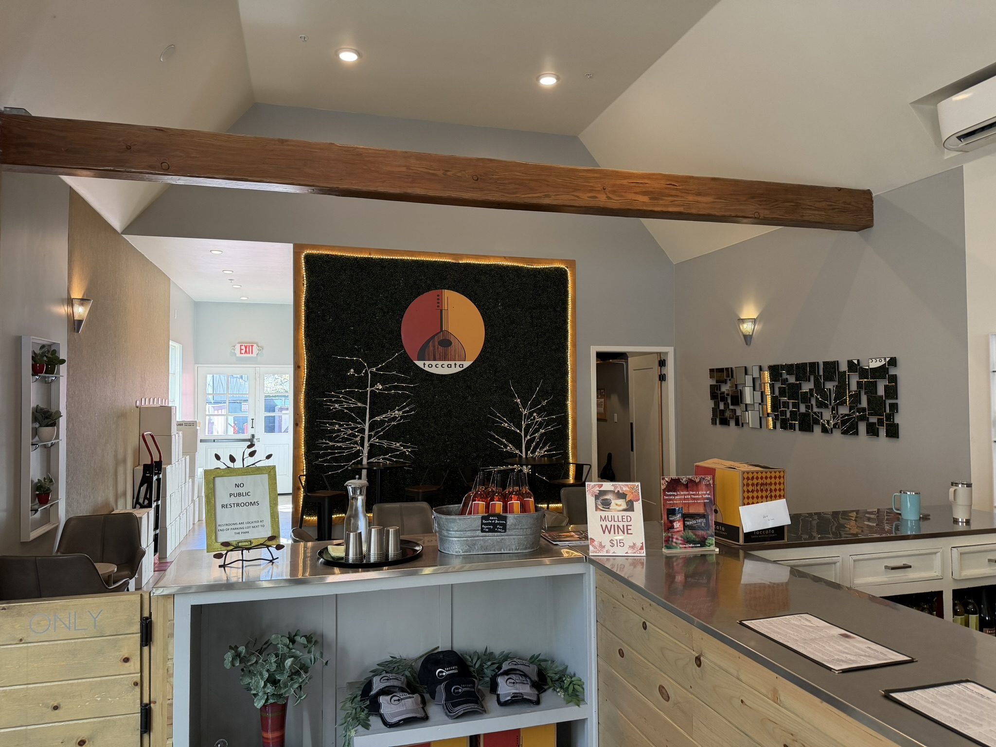 Outside, sidewalk seating allows visitors to observe the activity of the village. The setting is functional and accessible, designed for those exploring the local shops and restaurants. The tasting room is pet-friendly and often features live music during weekend peak hours, contributing to a convivial atmosphere.