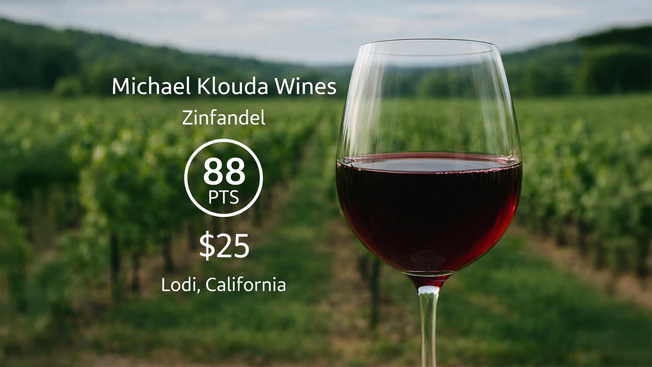 Old vine zinfandel from Lodi, California, is treasured by the wine community. This 2017 Michael Klouda Hatterle Zinfandel bottle is
